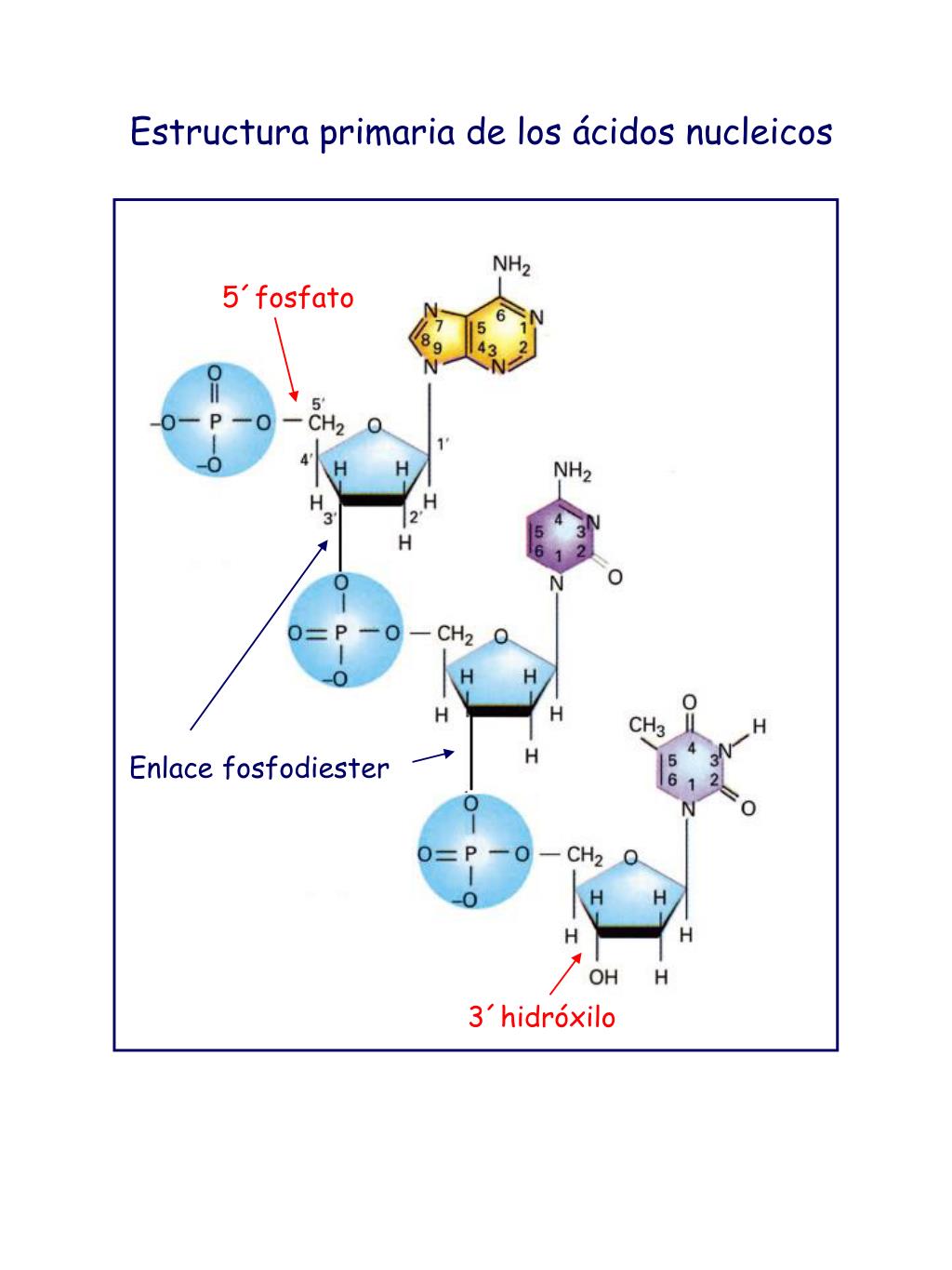 Estructura primaria de los ácidos nucleicos 5´fosfato Enlace fosfodiester 3´hidróxilo