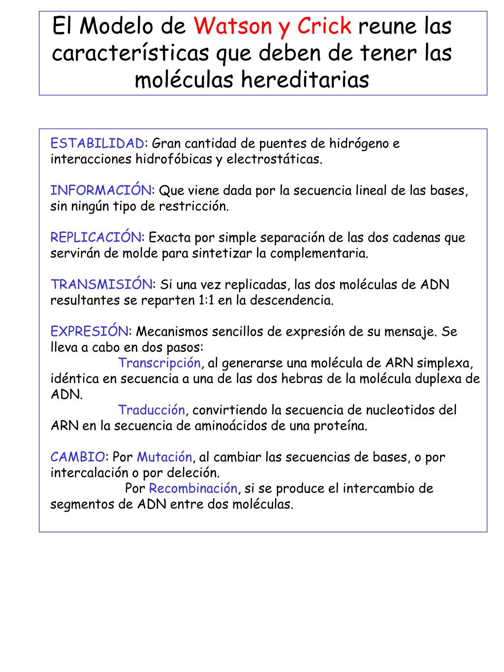 El Modelo de Watson y Crick reune las características que deben de tener las moléculas hereditarias ESTABILIDAD: Gran cantidad de puentes de hidrógeno e interacciones hidrofóbicas y electrostáticas. INFORMACIÓN: Que viene dada por la secuencia lineal de las bases, sin ningún tipo de restricción. REPLICACIÓN: Exacta por simple separación de las dos cadenas que servirán de molde para sintetizar la complementaria. TRANSMISIÓN: Si una vez replicadas, las dos moléculas de ADN resultantes se reparten 1:1 en la descendencia. EXPRESIÓN: Mecanismos sencillos de expresión de su mensaje. Se lleva a cabo en dos pasos: Transcripción, al generarse una molécula de ARN simplexa, idéntica en secuencia a una de las dos hebras de la molécula duplexa de ADN. Traducción, convirtiendo la secuencia de nucleotidos del ARN en la secuencia de aminoácidos de una proteína. CAMBIO: Por Mutación, al cambiar las secuencias de bases, o por intercalación o por deleción. Por Recombinación, si se produce el intercambio de segmentos de ADN entre dos moléculas.