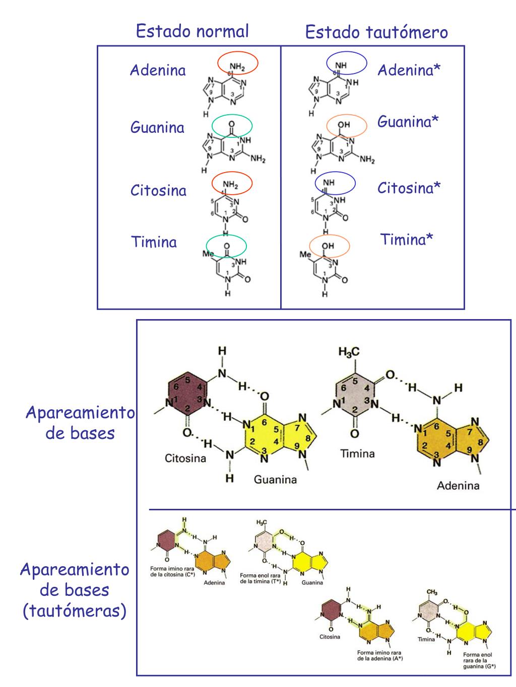 Estado normal Estado tautómero Adenina Adenina* Guanina* Guanina Citosina* Citosina Timina* Timina Apareamiento de bases Apareamientode bases (tautómeras)