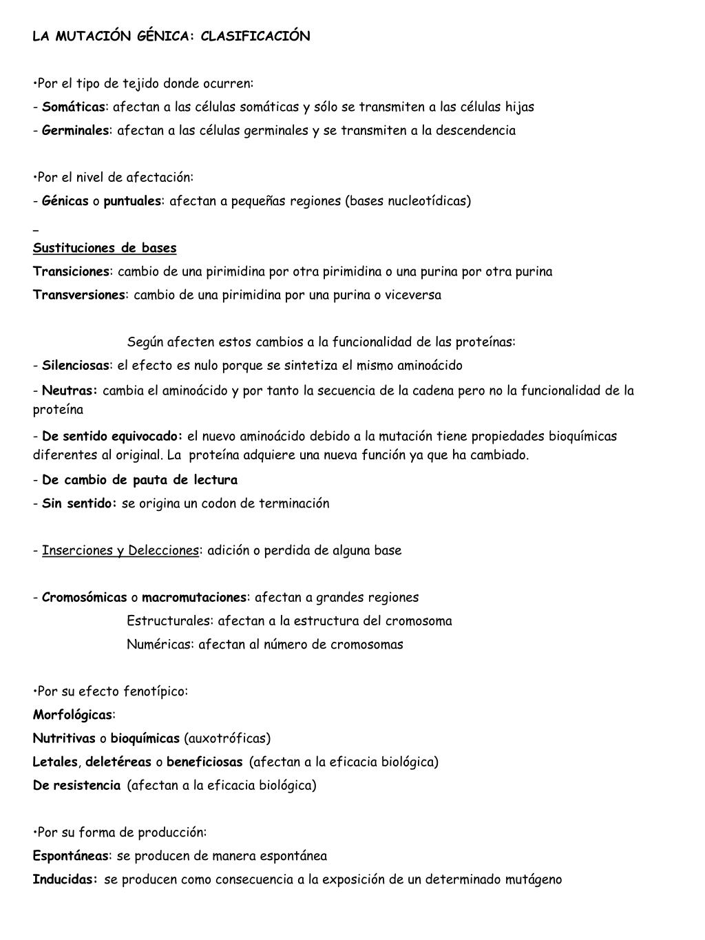 LA MUTACIÓN GÉNICA: CLASIFICACIÓN • Por el tipo de tejido donde ocurren: • - Somáticas: afectan a las células somáticas y sólo se transmiten a las células hijas • - Germinales: afectan a las células germinales y se transmiten a la descendencia • Por el nivel de afectación: • - Génicas o puntuales: afectan a pequeñas regiones (bases nucleotídicas) • Sustituciones de bases • Transiciones: cambio de una pirimidina por otra pirimidina o una purina por otra purina • Transversiones: cambio de una pirimidina por una purina o viceversa • Según afecten estos cambios a la funcionalidad de las proteínas: • - Silenciosas: el efecto es nulo porque se sintetiza el mismo aminoácido • - Neutras: cambia el aminoácido y por tanto la secuencia de la cadena pero no la funcionalidad de la proteína • - Desentidoequivocado: el nuevo aminoácido debido a la mutación tiene propiedades bioquímicas diferentes al original. La proteína adquiere una nueva función ya que ha cambiado. • - De cambio de pauta de lectura • - Sin sentido: se origina un codon de terminación • - Inserciones y Delecciones: adición o perdida de alguna base • - Cromosómicas o macromutaciones: afectan a grandes regiones • Estructurales: afectan a la estructura del cromosoma • Numéricas: afectan al número de cromosomas • Por su efecto fenotípico: • Morfológicas: • Nutritivas o bioquímicas (auxotróficas) • Letales, deletéreas o beneficiosas (afectan a la eficacia biológica) • Deresistencia (afectan a la eficacia biológica) • Por su forma de producción: • Espontáneas: se producen de manera espontánea • Inducidas: se producen como consecuencia a la exposición de un determinado mutágeno