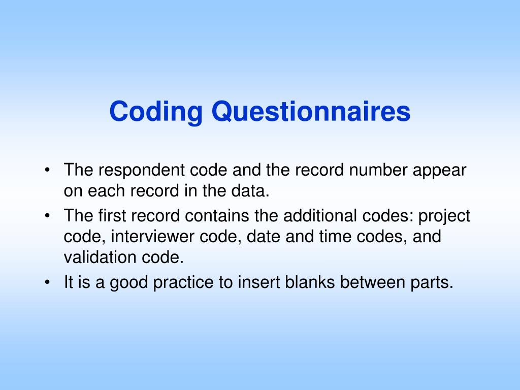 Coding Questionnaires • The respondent code and the record number appear on each record in the data. • The first record contains the additional codes: project code, interviewer code, date and time codes, and validation code. • It is a good practice to insert blanks between parts.