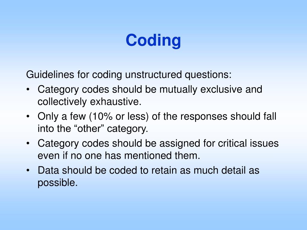 Coding Guidelines for coding unstructured questions: • Category codes should be mutually exclusive and collectively exhaustive. • Only a few (10% or less) of the responses should fall into the “other” category. • Category codes should be assigned for critical issues even if no one has mentioned them. • Data should be coded to retain as much detail as possible.