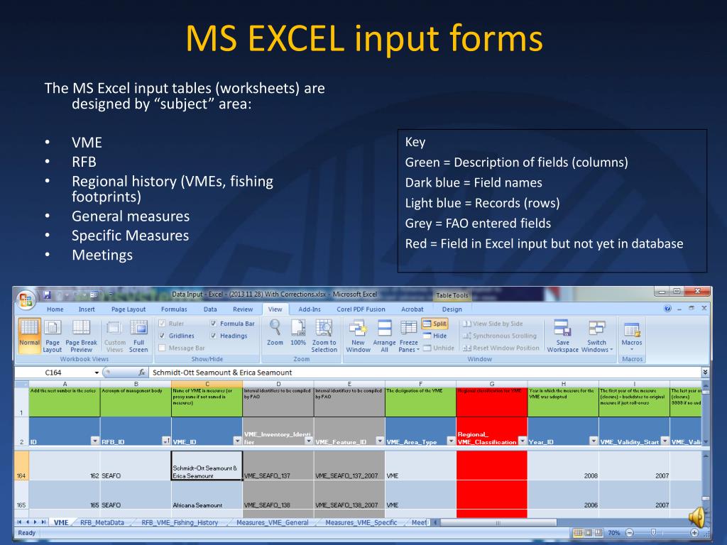 MS EXCEL input forms The MS Excel input tables (worksheets) are designed by “subject” area: • VME • RFB • Regional history (VMEs, fishing footprints) • General measures • Specific Measures • Meetings Key Green = Description of fields (columns) Dark blue = Field names Light blue = Records (rows) Grey = FAO entered fields Red = Field in Excel input but not yet in database