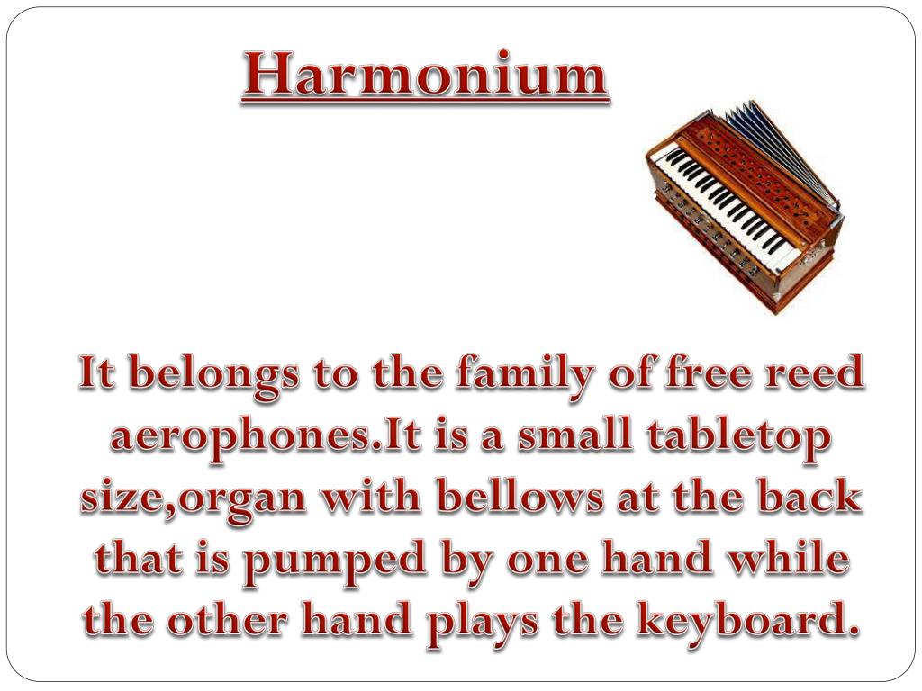 Harmonium It belongs to the family of free reed aerophones.It is a small tabletop size,organ with bellows at the back that is pumped by one hand while the other hand plays the keyboard.