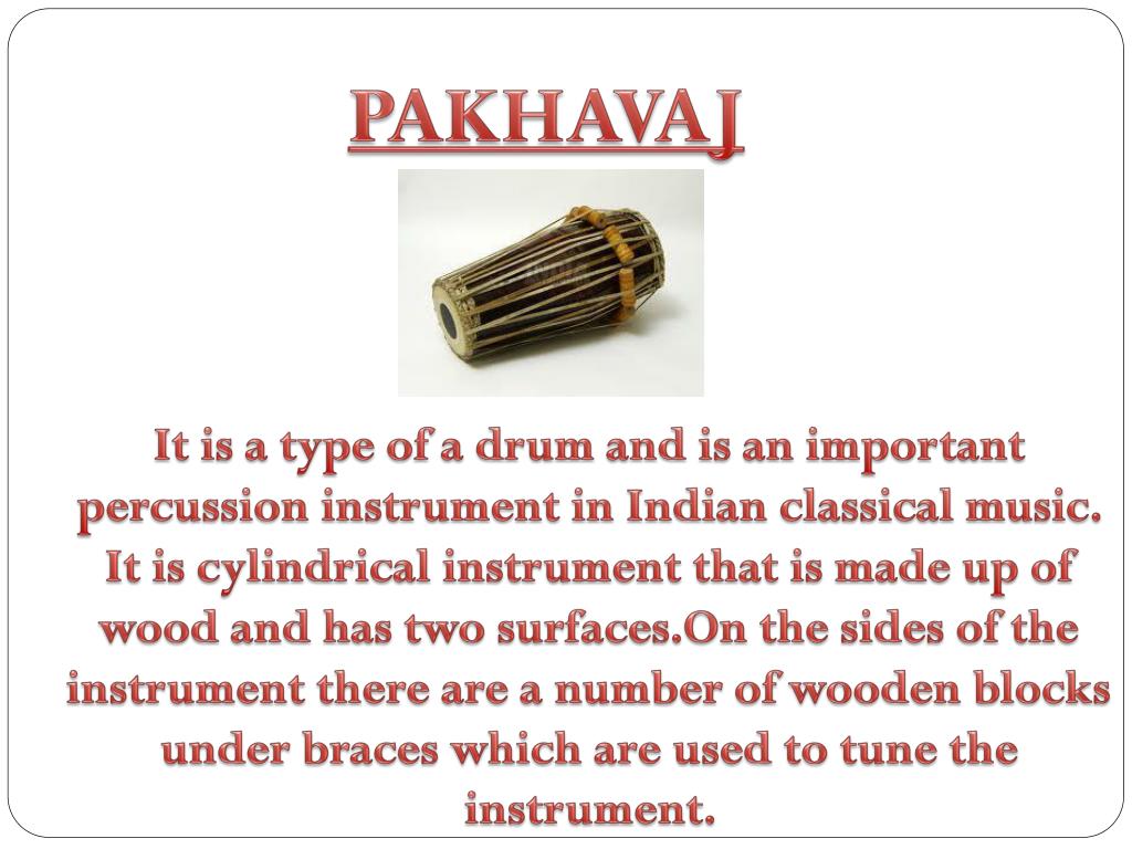 PAKHAVAJ It is a type of a drum and is an important percussion instrument in Indian classical music. It is cylindrical instrument that is made up of wood and has two surfaces.On the sides of the instrument there are a number of wooden blocks under braces which are used to tune the instrument.