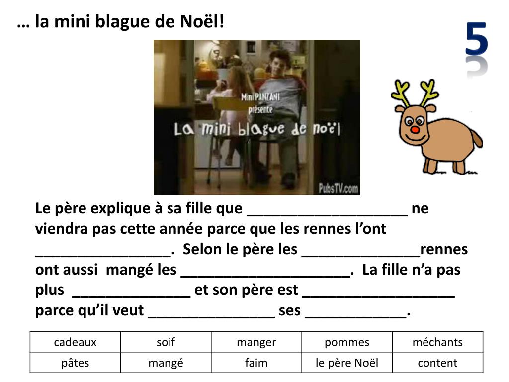 5 … la mini blague de Noël! Le père explique à sa fille que ___________________ ne viendra pas cette année parce que les rennes l’ont ________________. Selon le père les ______________rennes ont aussi mangé les ____________________. La fille n’a pas plus ______________ et son père est __________________ parce qu’il veut _______________ ses ____________.