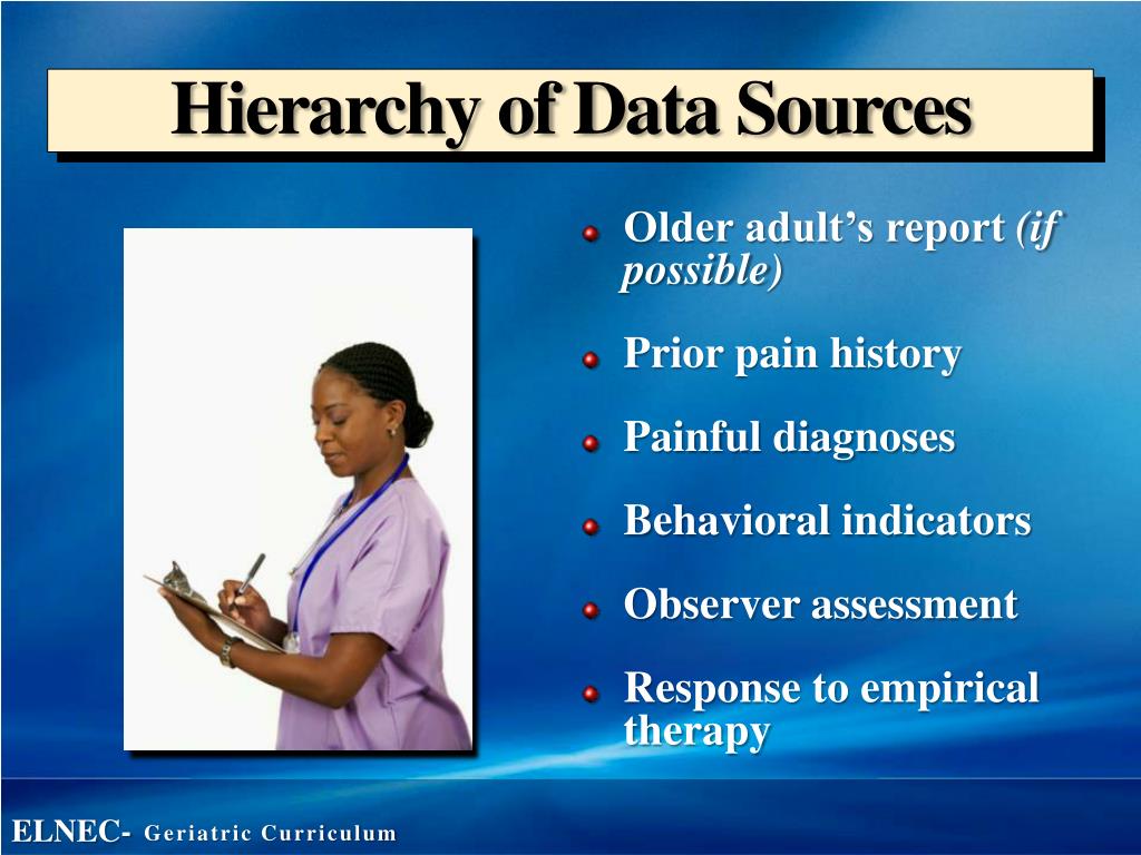 Hierarchy of Data Sources • Older adult’s report (if possible) • Prior pain history • Painful diagnoses • Behavioral indicators • Observer assessment • Response to empirical therapy
