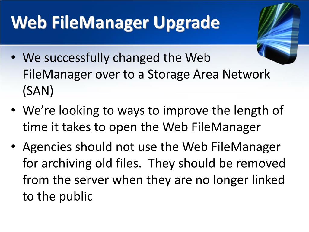 Web FileManager Upgrade • We successfully changed the Web FileManager over to a Storage Area Network (SAN) • We’re looking to ways to improve the length of time it takes to open the Web FileManager • Agencies should not use the Web FileManager for archiving old files. They should be removed from the server when they are no longer linked to the public