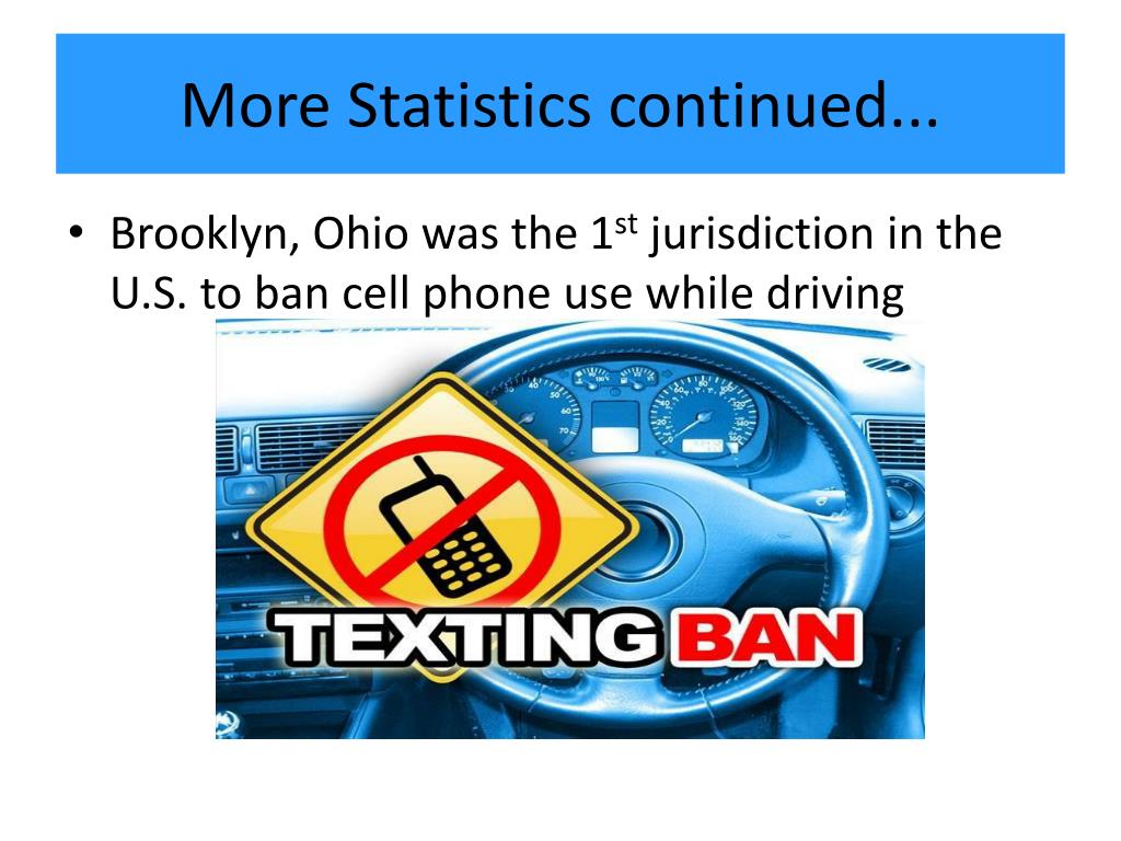 More Statistics continued... • Brooklyn, Ohio was the 1st jurisdiction in the U.S. to ban cell phone use while driving