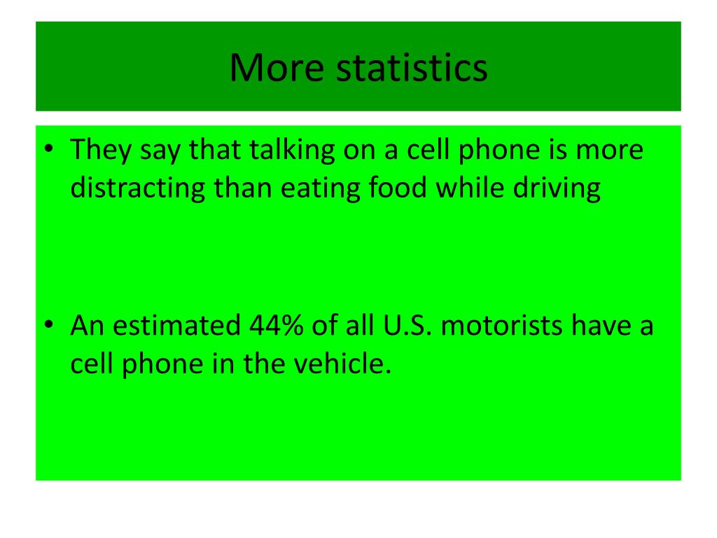 More statistics • They say that talking on a cell phone is more distracting than eating food while driving • An estimated 44% of all U.S. motorists have a cell phone in the vehicle.