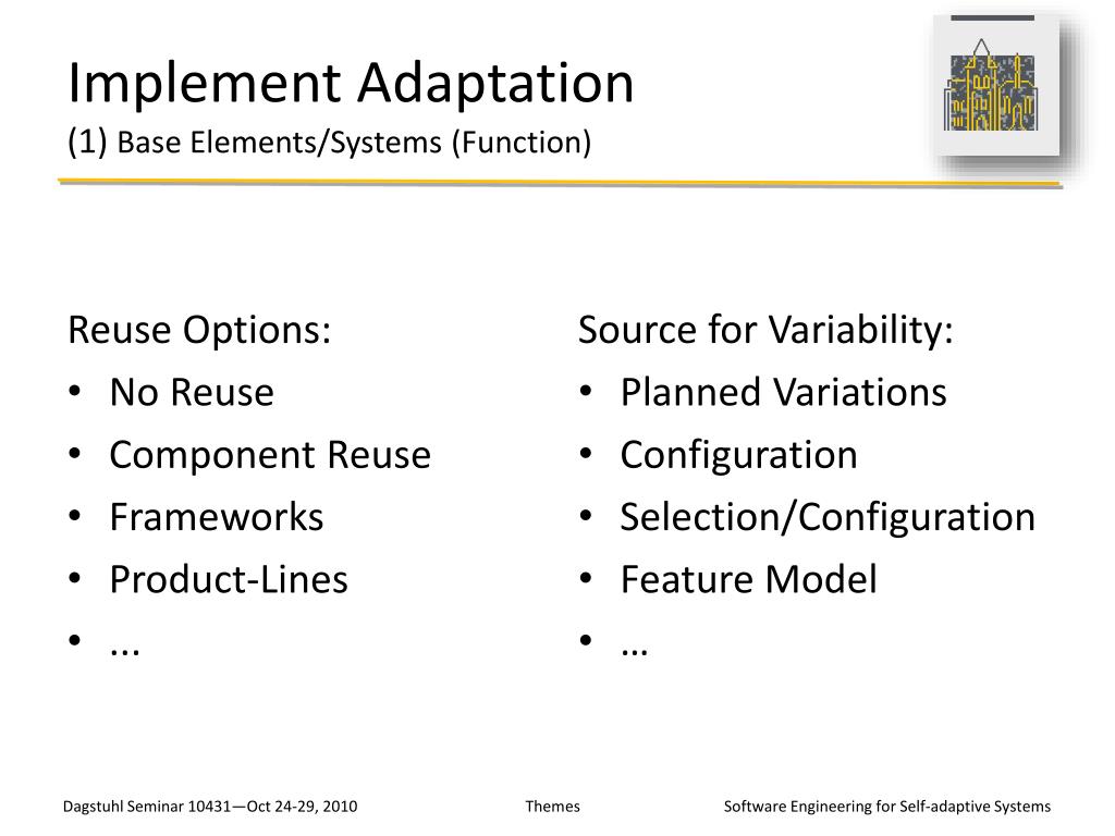 Reuse Options: No Reuse Component Reuse Frameworks Product-Lines ... Implement Adaptation(1) Base Elements/Systems (Function) Source for Variability: • Planned Variations • Configuration • Selection/Configuration • Feature Model • …