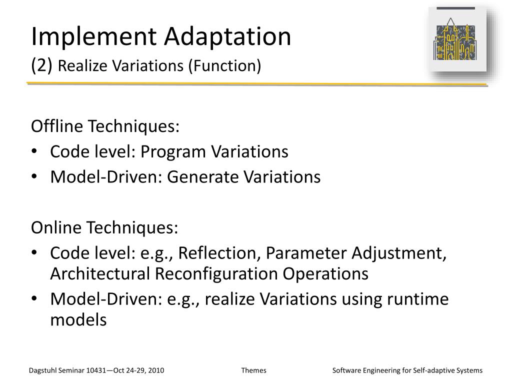 Implement Adaptation(2) (Adaptation Engine) Online Techniques: • Code level: • Rule-based adjustment • Generate & evaluate • … • Model-Driven: e.g., determine suitable Variations on the fly using runtime models • Rule-based adjustment • Generate & evaluate • …