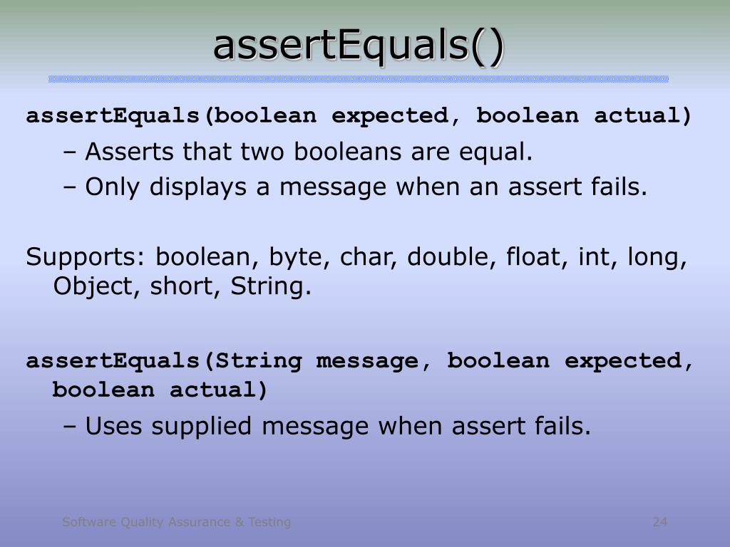 assertEquals() assertEquals(boolean expected, boolean actual) • Asserts that two booleans are equal. • Only displays a message when an assert fails. Supports: boolean, byte, char, double, float, int, long, Object, short, String. assertEquals(String message, boolean expected, boolean actual) • Uses supplied message when assert fails. Software Quality Assurance & Testing