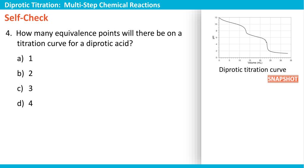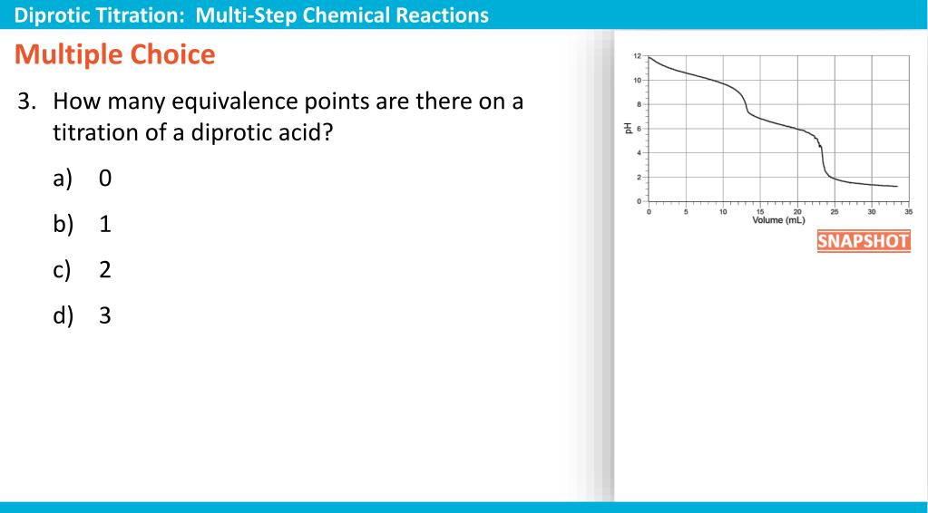 Diprotic Titration: Multi-Step Chemical Reactions Multiple Choice • How many equivalence points are there on a titration of a diprotic acid? • 0 • 1 • 2 • 3