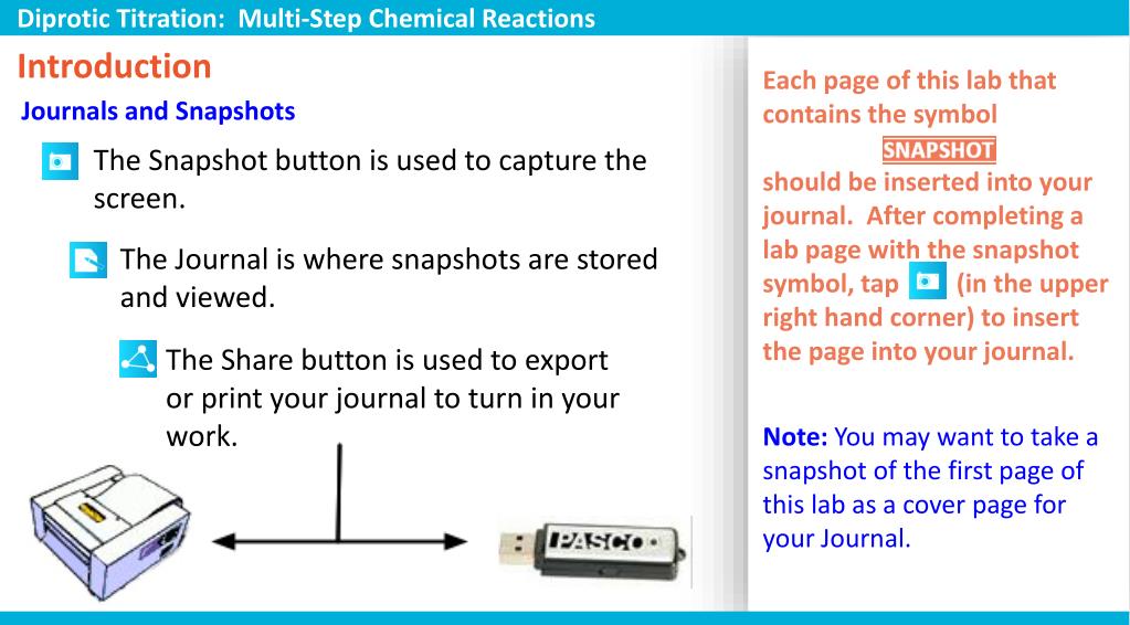 Diprotic Titration: Multi-Step Chemical Reactions Introduction Each page of this lab that contains the symbol should be inserted into your journal. After completing a lab page with the snapshot symbol, tap (in the upper right hand corner) to insert the page into your journal. Journals and Snapshots The Snapshot button is used to capture the screen. The Journal is where snapshots are stored and viewed. The Share button is used to export or print your journal to turn in your work. Note: You may want to take a snapshot of the first page of this lab as a cover page for your Journal.