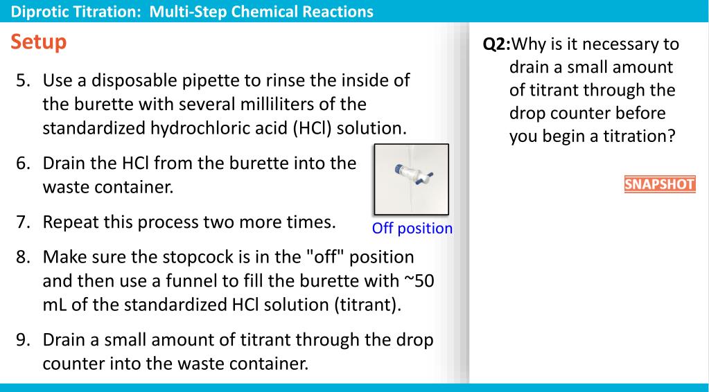 Diprotic Titration: Multi-Step Chemical Reactions Setup Q2:Why is it necessary to drain a small amount of titrant through the drop counter before you begin a titration? • Use a disposable pipette to rinse the inside of the burette with several milliliters of the standardized hydrochloric acid (HCl) solution. • Drain the HCl from the burette into the waste container. • Repeat this process two more times. • Make sure the stopcock is in the "off" position and then use a funnel to fill the burette with ~50 mL of the standardized HCl solution (titrant). • Drain a small amount of titrant through the drop counter into the waste container. Off position