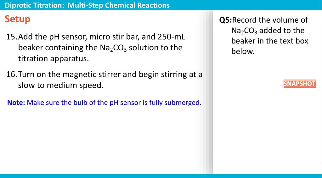 Diprotic Titration: Multi-Step Chemical Reactions Setup Q5:Record the volume of Na2CO3 added to the beaker in the text box below. • Add the pH sensor, micro stir bar, and 250-mL beaker containing the Na2CO3 solution to the titration apparatus. • Turn on the magnetic stirrer and begin stirring at a slow to medium speed. Note:Make sure the bulb of the pH sensor is fully submerged.