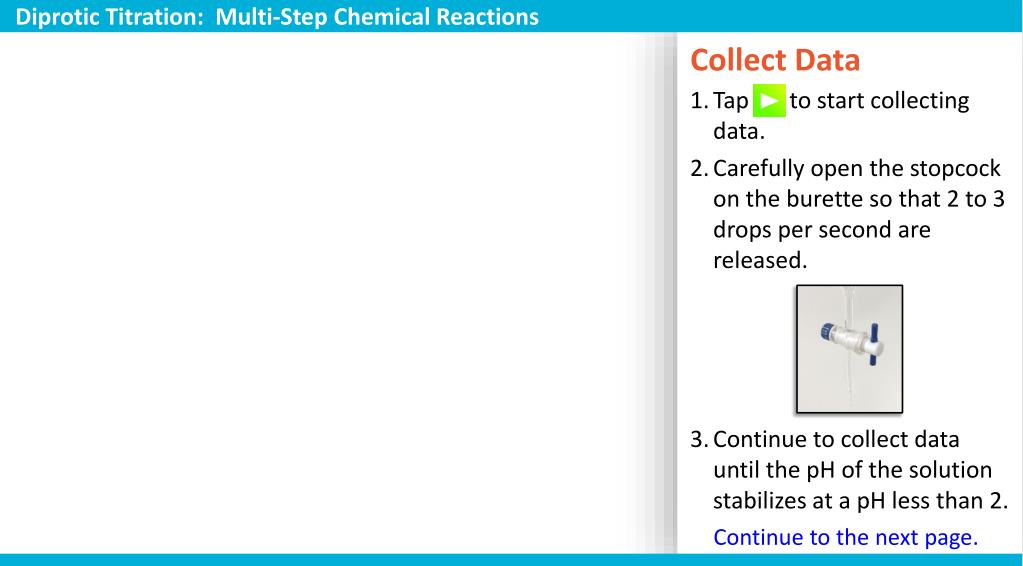 Diprotic Titration: Multi-Step Chemical Reactions Collect Data • Tap to start collecting data. • Carefully open the stopcock on the burette so that 2 to 3 drops per second are released. • Continue to collect data until the pH of the solution stabilizes at a pH less than 2. Continue to the next page.