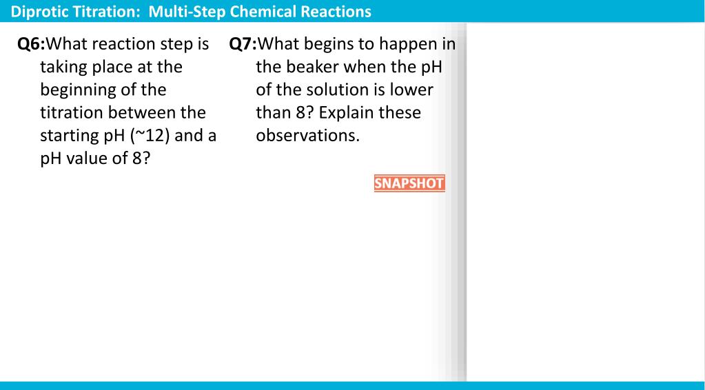 Diprotic Titration: Multi-Step Chemical Reactions Q6:What reaction step is taking place at the beginning of the titration between the starting pH (~12) and a pH value of 8? Q7:What begins to happen in the beaker when the pH of the solution is lower than 8? Explain these observations.