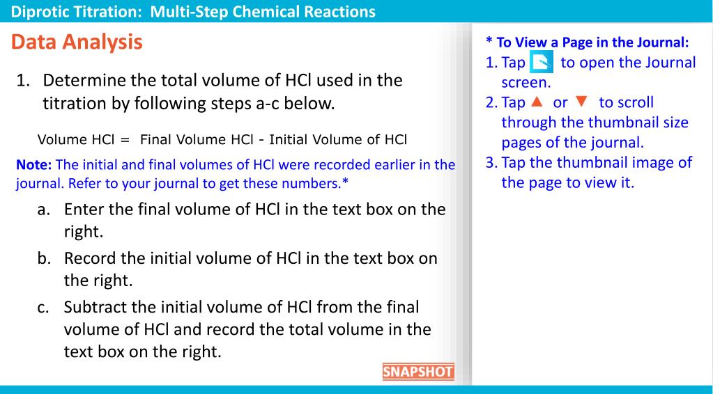 Diprotic Titration: Multi-Step Chemical Reactions Data Analysis • * To View a Page in the Journal: • Tap to open the Journal screen. • Tap or to scroll through the thumbnail size pages of the journal. • Tap the thumbnail image of the page to view it. • Determine the total volume of HCl used in the titration by following steps a-c below. Volume HCl = Final Volume HCl - Initial Volume of HCl Note:The initial and final volumes of HCl were recorded earlier in the journal. Refer to your journal to get these numbers.* Enter the final volume of HCl in the text box on the right. Record the initial volume of HCl in the text box on the right. Subtract the initial volume of HCl from the final volume of HCl and record the total volume in the text box on the right.