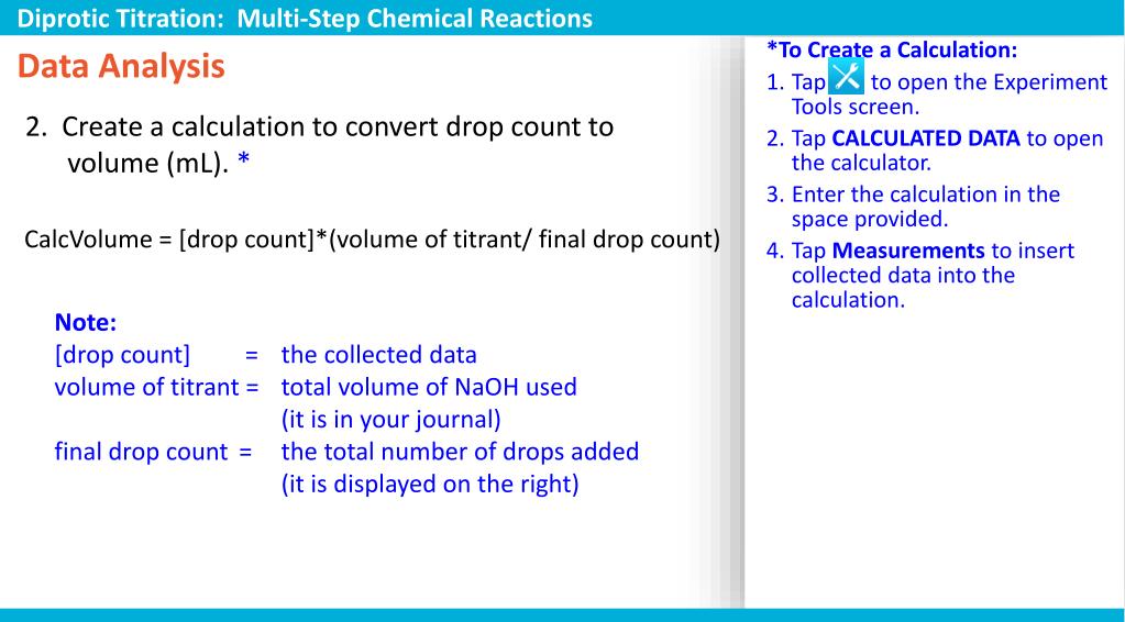 Diprotic Titration: Multi-Step Chemical Reactions *To Create a Calculation: • Tap to open the Experiment Tools screen. • Tap CALCULATED DATAto open the calculator. • Enter the calculation in the space provided. • Tap Measurements to insert collected data into the calculation. Data Analysis 2. Create a calculation to convert drop count to volume (mL). * CalcVolume= [drop count]*(volume of titrant/ final drop count) Note: [drop count] = the collected data volume of titrant = total volume of NaOH used (it is in your journal) final drop count = the total number of drops added (it is displayed on the right)