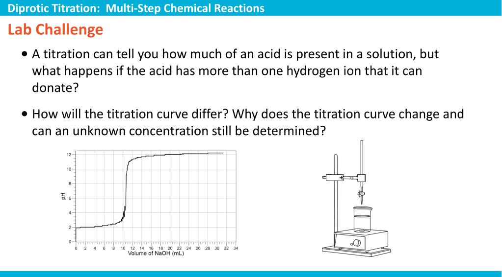 Diprotic Titration: Multi-Step Chemical Reactions Lab Challenge • A titration can tell you how much of an acid is present in a solution, but what happens if the acid has more than one hydrogen ion that it can donate? • How will the titration curve differ? Why does the titration curve change and can an unknown concentration still be determined?