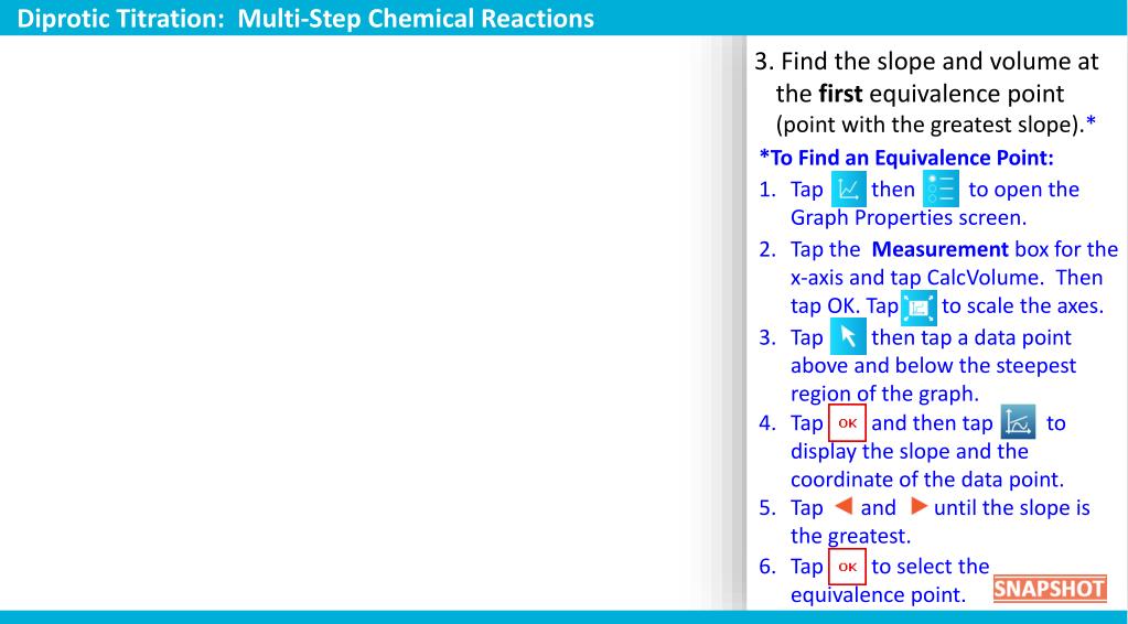 Diprotic Titration: Multi-Step Chemical Reactions 3. Find the slope and volume at the firstequivalence point (point with the greatest slope).* *To Find an Equivalence Point: Tap then to open the Graph Properties screen. Tap the Measurement box for the x-axis and tap CalcVolume. Then tap OK. Tap to scale the axes. Tap then tap a data point above and below the steepest region of the graph. Tap and then tap to display the slope and the coordinate of the data point. Tap and until the slope is the greatest. Tap to select the equivalence point.