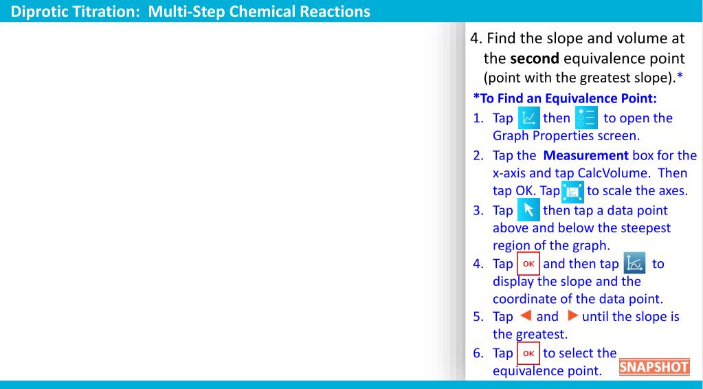 Diprotic Titration: Multi-Step Chemical Reactions 4. Find the slope and volume at the secondequivalence point (point with the greatest slope).* *To Find an Equivalence Point: Tap then to open the Graph Properties screen. Tap the Measurement box for the x-axis and tap CalcVolume. Then tap OK. Tap to scale the axes. Tap then tap a data point above and below the steepest region of the graph. Tap and then tap to display the slope and the coordinate of the data point. Tap and until the slope is the greatest. Tap to select the equivalence point.