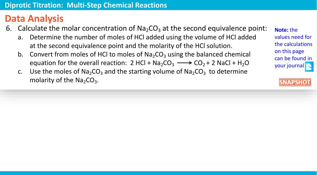 Diprotic Titration: Multi-Step Chemical Reactions Data Analysis • Note: the values need for the calculations on this page can be found in your journal . • Calculate the molar concentration of Na2CO3 at the first equivalence point: • Determine the number of moles of HCl added using the volume of HCl added at the first equivalence point and the molarity of the HCl solution. • Convert from moles of HCl to moles of Na2CO3 using the balanced chemical equation for the first reaction step: HCl+ Na2CO3 NaHCO3 + NaCl • Use the moles of Na2CO3 and the starting volume of Na2CO3to determine molarityof the Na2CO3.