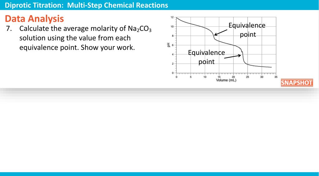 Diprotic Titration: Multi-Step Chemical Reactions Data Analysis Equivalence point • Calculate the average molarity of Na2CO3 solution using the value from each equivalence point. Show your work. Equivalence point