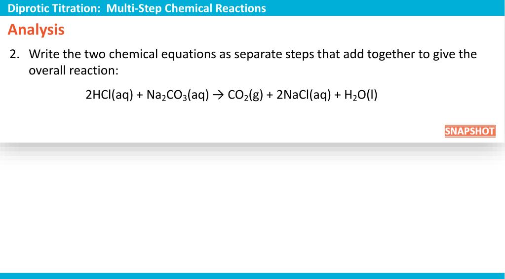 Diprotic Titration: Multi-Step Chemical Reactions Analysis • Write the two chemical equations as separate steps that add together to give the overall reaction: 2HCl(aq) + Na2CO3(aq) → CO2(g) + 2NaCl(aq) + H2O(l)