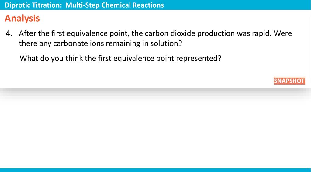 Diprotic Titration: Multi-Step Chemical Reactions Analysis • After the first equivalence point, the carbon dioxide production was rapid. Were there any carbonate ions remaining in solution? • What do you think the first equivalence point represented?