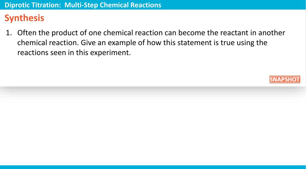 Diprotic Titration: Multi-Step Chemical Reactions Synthesis • Often the product of one chemical reaction can become the reactant in another chemical reaction. Give an example of how this statement is true using the reactions seen in this experiment.