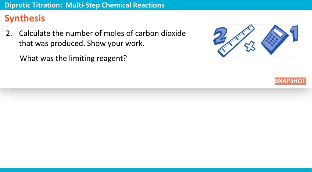 Diprotic Titration: Multi-Step Chemical Reactions Synthesis • Calculate the number of moles of carbon dioxide that was produced. Show your work. • What was the limiting reagent?