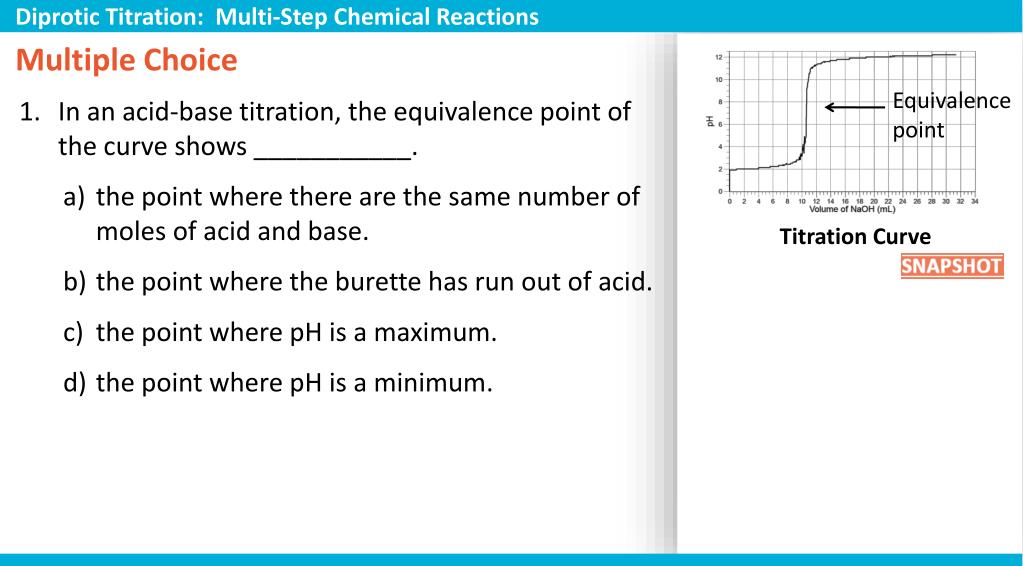 Diprotic Titration: Multi-Step Chemical Reactions Multiple Choice Equivalence point • In an acid-base titration, the equivalence point of the curve shows ___________. • the point where there are the same number of moles of acid and base. • the point where the burette has run out of acid. • the point where pH is a maximum. • the point where pH is a minimum. Titration Curve