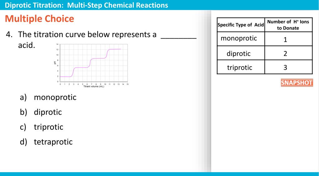 Diprotic Titration: Multi-Step Chemical Reactions Multiple Choice Number of H+ Ions to Donate Specific Type of Acid • The titration curve below represents a ________ acid. monoprotic 1 diprotic 2 triprotic 3 monoprotic diprotic triprotic tetraprotic