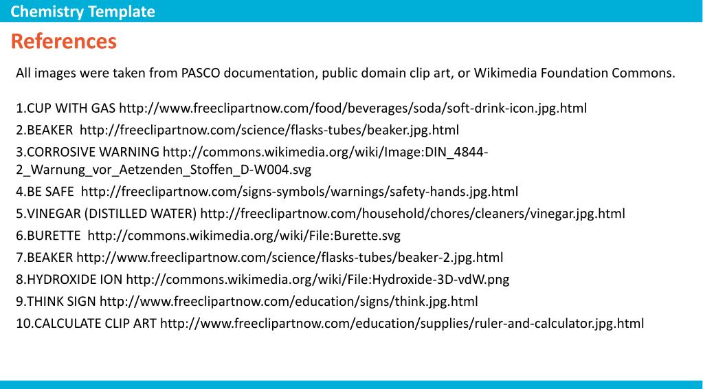 Chemistry Template References • All images were taken from PASCO documentation, public domain clip art, or Wikimedia Foundation Commons. • CUP WITH GAS http://www.freeclipartnow.com/food/beverages/soda/soft-drink-icon.jpg.html • BEAKER http://freeclipartnow.com/science/flasks-tubes/beaker.jpg.html • CORROSIVE WARNING http://commons.wikimedia.org/wiki/Image:DIN_4844-2_Warnung_vor_Aetzenden_Stoffen_D-W004.svg • BE SAFE http://freeclipartnow.com/signs-symbols/warnings/safety-hands.jpg.html • VINEGAR (DISTILLED WATER) http://freeclipartnow.com/household/chores/cleaners/vinegar.jpg.html • BURETTE http://commons.wikimedia.org/wiki/File:Burette.svg • BEAKER http://www.freeclipartnow.com/science/flasks-tubes/beaker-2.jpg.html • HYDROXIDE ION http://commons.wikimedia.org/wiki/File:Hydroxide-3D-vdW.png • THINK SIGN http://www.freeclipartnow.com/education/signs/think.jpg.html • CALCULATE CLIP ART http://www.freeclipartnow.com/education/supplies/ruler-and-calculator.jpg.html