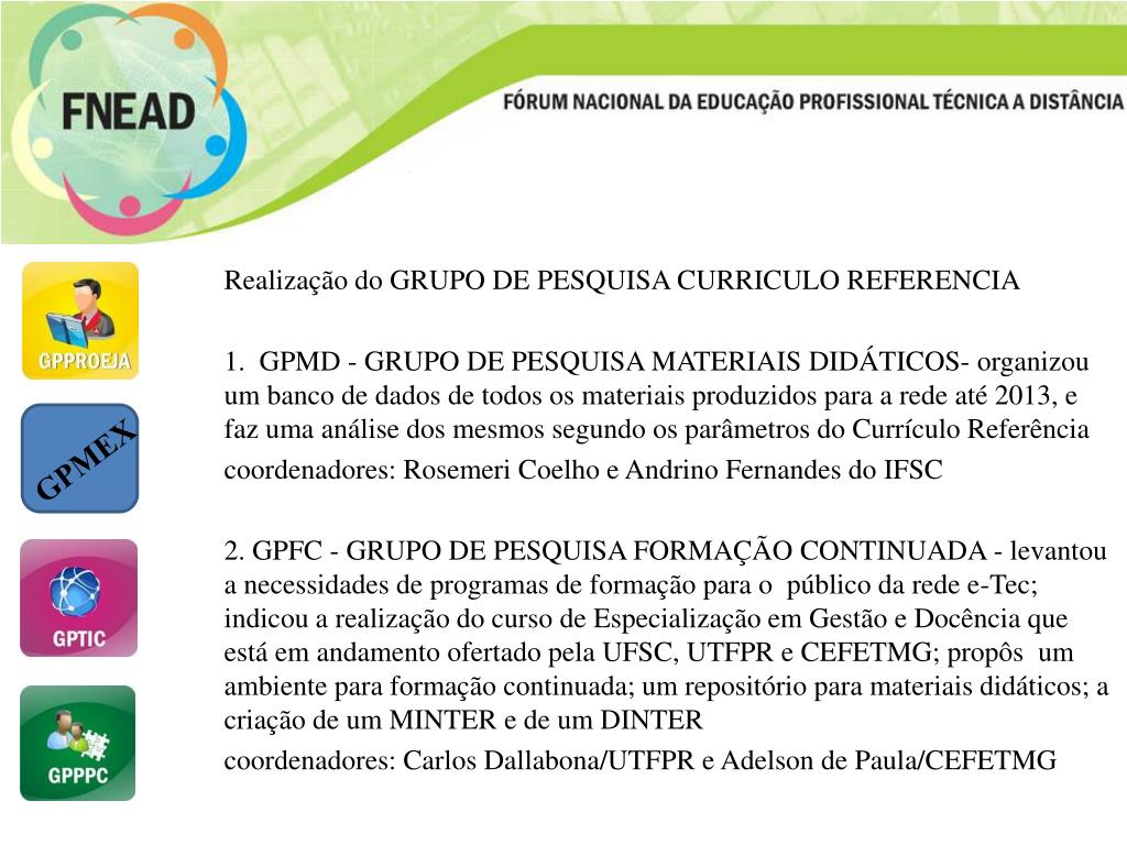 Realização do GRUPO DE PESQUISA CURRICULO REFERENCIA 1. GPMD - GRUPO DE PESQUISA MATERIAIS DIDÁTICOS- organizou um banco de dados de todos os materiais produzidos para a rede até 2013, e faz uma análise dos mesmos segundo os parâmetros do Currículo Referência coordenadores: Rosemeri Coelho e Andrino Fernandes do IFSC 2. GPFC - GRUPO DE PESQUISA FORMAÇÃO CONTINUADA - levantou a necessidades de programas de formação para o público da rede e-Tec; indicou a realização do curso de Especialização em Gestão e Docência que está em andamento ofertado pela UFSC, UTFPR e CEFETMG; propôs um ambiente para formação continuada; um repositório para materiais didáticos; a criação de um MINTER e de um DINTER coordenadores: Carlos Dallabona/UTFPR e Adelson de Paula/CEFETMG GPMEX