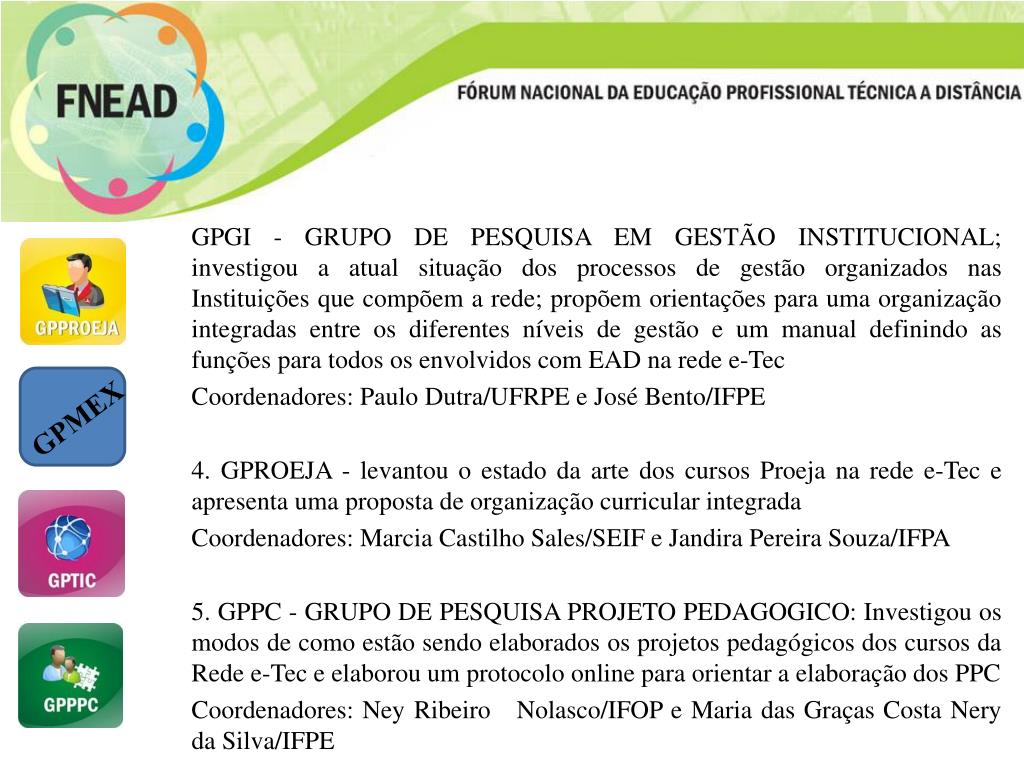 GPGI - GRUPO DE PESQUISA EM GESTÃO INSTITUCIONAL; investigou a atual situação dos processos de gestão organizados nas Instituições que compõem a rede; propõem orientações para uma organização integradas entre os diferentes níveis de gestão e um manual definindo as funções para todos os envolvidos com EAD na rede e-Tec Coordenadores: Paulo Dutra/UFRPE e José Bento/IFPE 4. GPROEJA - levantou o estado da arte dos cursos Proeja na rede e-Tec e apresenta uma proposta de organização curricular integrada Coordenadores: Marcia Castilho Sales/SEIF e Jandira Pereira Souza/IFPA 5. GPPC - GRUPO DE PESQUISA PROJETO PEDAGOGICO: Investigou os modos de como estão sendo elaborados os projetos pedagógicos dos cursos da Rede e-Tec e elaborou um protocolo online para orientar a elaboração dos PPC Coordenadores: Ney Ribeiro Nolasco/IFOP e Maria das Graças Costa Nery da Silva/IFPE GPMEX