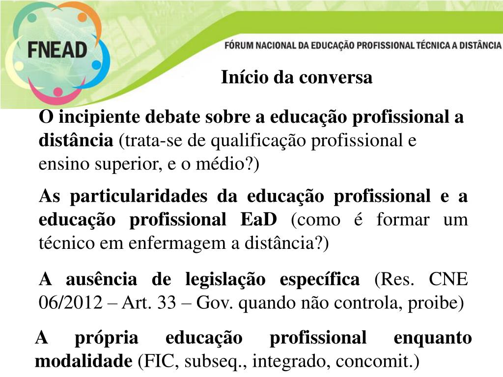 Início da conversa O incipiente debate sobre a educação profissional a distância (trata-se de qualificação profissional e ensino superior, e o médio?) As particularidades da educação profissional e a educação profissional EaD (como é formar um técnico em enfermagem a distância?) A ausência de legislação específica (Res. CNE 06/2012 – Art. 33 – Gov. quando não controla, proibe) A própria educação profissional enquanto modalidade (FIC, subseq., integrado, concomit.)