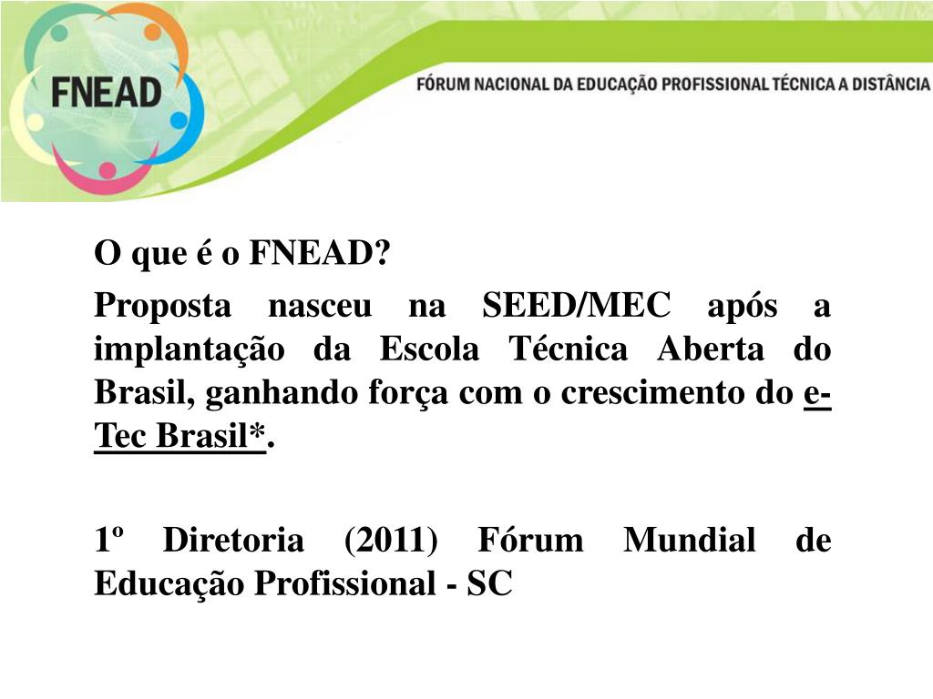 O que é o FNEAD? Proposta nasceu na SEED/MEC após a implantação da Escola Técnica Aberta do Brasil, ganhando força com o crescimento do e-Tec Brasil*. 1º Diretoria (2011) Fórum Mundial de Educação Profissional - SC
