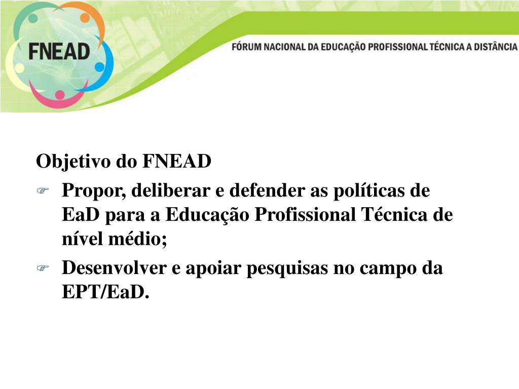 Objetivo do FNEAD • Propor, deliberar e defender as políticas de EaD para a Educação Profissional Técnica de nível médio; • Desenvolver e apoiar pesquisas no campo da EPT/EaD.