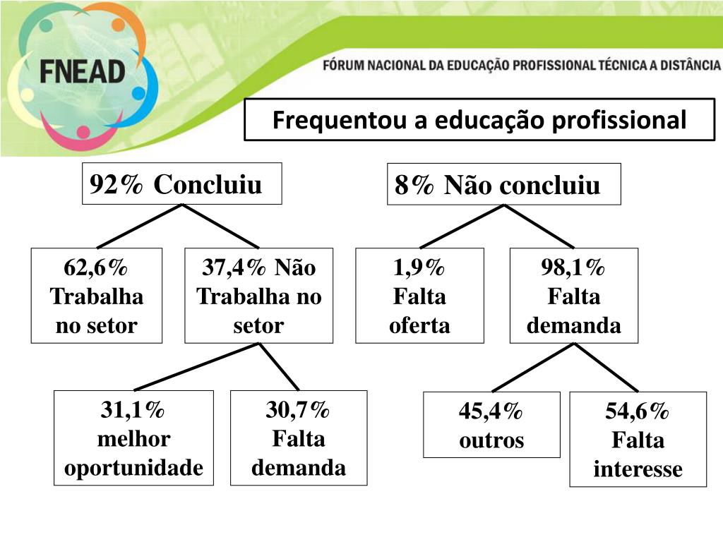 Frequentou a educaçãoprofissional 92% Concluiu 8% Não concluiu 62,6% Trabalha no setor 37,4% Não Trabalha no setor 1,9% Falta oferta 98,1% Falta demanda 31,1% melhor oportunidade 30,7% Falta demanda 45,4% outros 54,6% Falta interesse