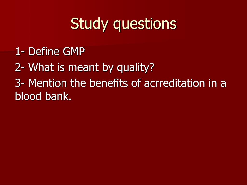 Study questions 1- Define GMP 2- What is meant by quality? 3- Mention the benefits of acrreditation in a blood bank.
