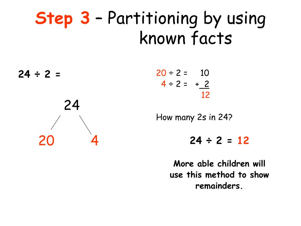 24 ÷ 2 = 24 204 20÷ 2 = 10 4÷ 2 = + 2 12 How many 2s in 24? 24 ÷ 2 = 12 More able children will use this method to show remainders. Step 3 – Partitioning by using known facts