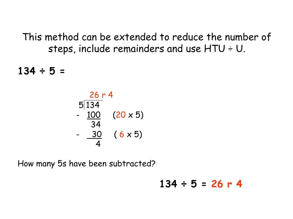 This method can be extended to reduce the number of steps, include remainders and use HTU ÷ U. 134 ÷ 5 = 26 r 4 5 134 - 100 (20 x 5) 34 - 30 ( 6 x 5) 4 How many 5s have been subtracted? 134 ÷ 5 = 26 r 4