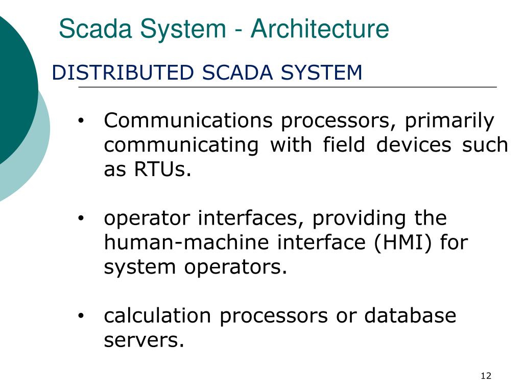 Scada System - Architecture DISTRIBUTED SCADA SYSTEM • Communications processors, primarily • communicating with field devices such as RTUs. • operator interfaces, providing the human-machine interface (HMI) for system operators. • calculation processors or database servers.