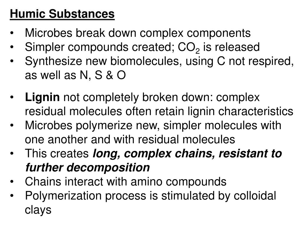 Humic Substances • Microbes break down complex components • Simpler compounds created; CO2 is released • Synthesize new biomolecules, using C not respired, • as well as N, S & O • Lignin not completely broken down: complex • residual molecules often retain lignin characteristics • Microbes polymerize new, simpler molecules with • one another and with residual molecules • This creates long, complex chains, resistant to • further decomposition • Chains interact with amino compounds • Polymerization process is stimulated by colloidal • clays