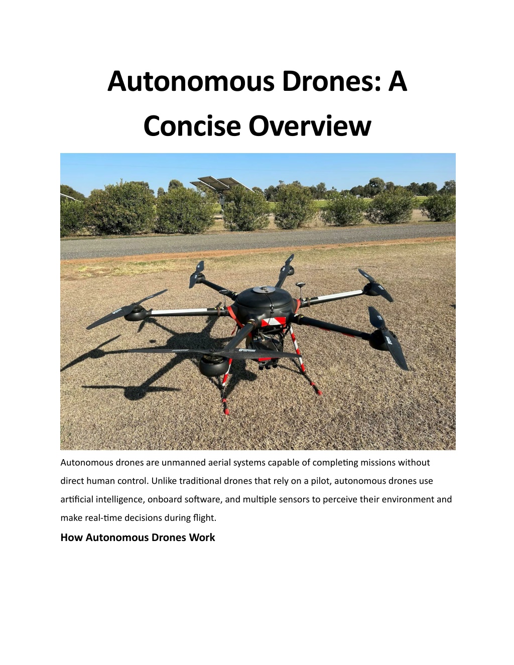 1. Autonomous Drones: A Concise Overview Autonomous drones are unmanned aerial systems capable of completing missions without direct human control. Unlike traditional drones that rely on a pilot, autonomous drones use artificial intelligence, onboard software, and multiple sensors to perceive their environment and make real-time decisions during flight. How Autonomous Drones Work