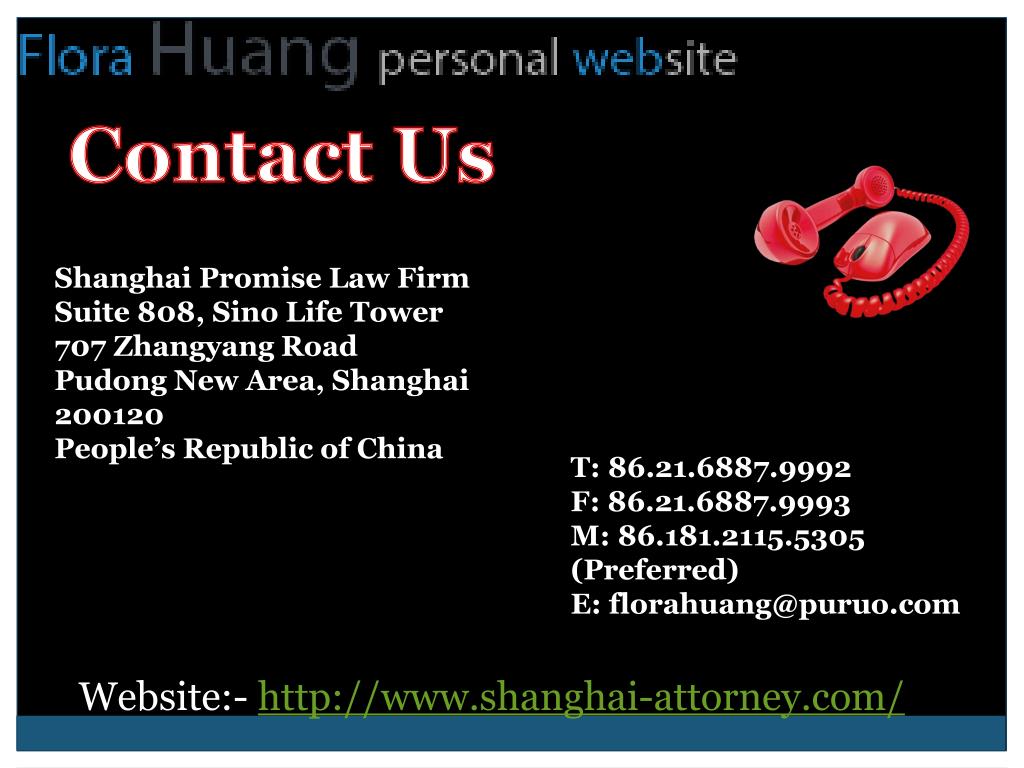 Contact Us Shanghai Promise Law FirmSuite 808, Sino Life Tower 707 Zhangyang Road Pudong New Area, Shanghai 200120 People’s Republic of China T: 86.21.6887.9992 F: 86.21.6887.9993 M: 86.181.2115.5305 (Preferred)E: florahuang@puruo.com Website:- http://www.shanghai-attorney.com/